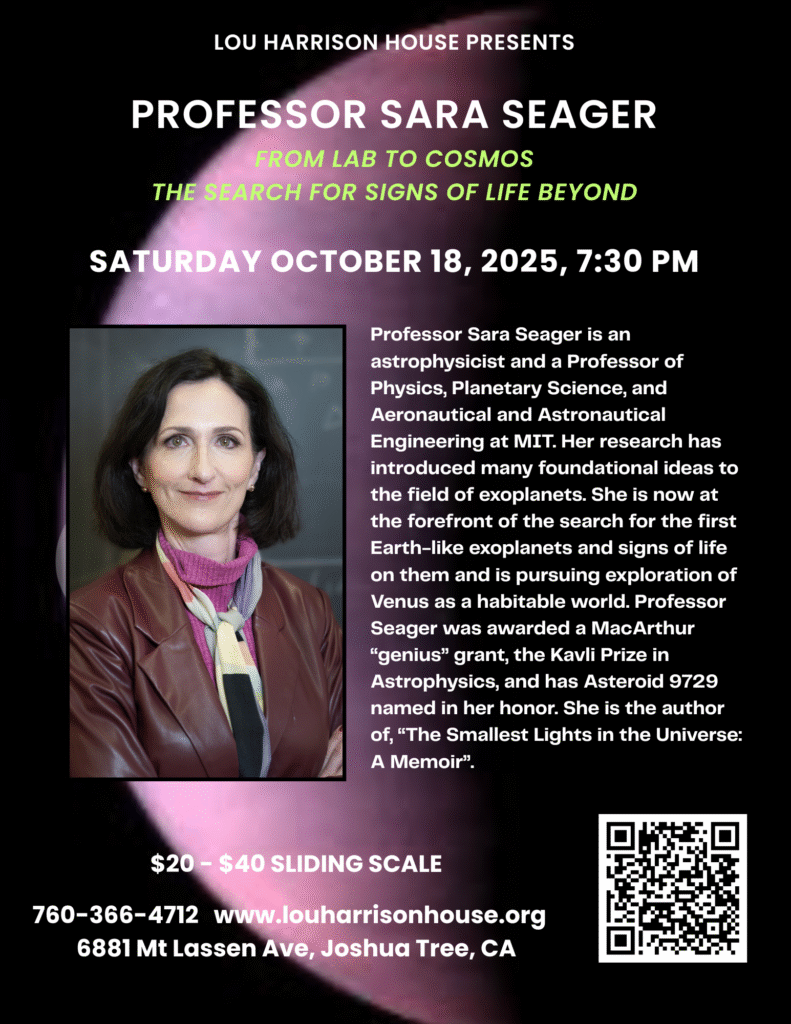 Saturday, October 18th, 7:30pm – A Talk with Sara Seager: From Lab to Cosmos…The Search for Signs of Life Beyond. $20-40 Sliding Scale